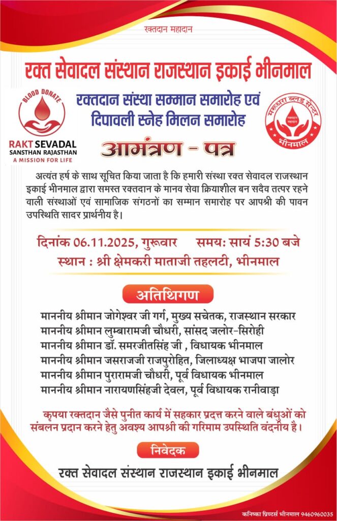दीपावली स्नेह मिलन एवं रक्तदान सस्थाऐ सम्मान समारोह 6 नवम्बर कोभीनमाल। रक्त सेवादल संस्थान राजस्थान इकाई, भीनमाल के बैनर तले दिनांक 6 नवम्बर 2025 को दीपावली स्नेह मिलन एवं रक्तदान सम्मान समारोह का आयोजन किया जाएगा। यह कार्यक्रम क्षेमंकरी माताजी की तलहटी में भव्य रूप से आयोजित होगा।कार्यक्रम में बतौर मुख्य अतिथि सांसद श्री लुम्बाराम चौधरी, विशिष्ट अतिथि के रूप में मुख्य सचेतक श्री जोगेश्वर गर्ग, भीनमाल विधायक डॉ. समरजीत सिंह , भाजपा जिला अध्यक्ष जसराज राजपुरोहित, पूर्व विधायक भीनमाल पुराराम , पूर्व विधायक रनिवाड़ा श्री नारायण सिंह , तथा पूर्व चेयरमैन एवं भाजपा प्रदेश मंत्री सांवलाराम देवासी उपस्थित रहेंगे।कार्यक्रम में भीनमाल के सभी ट्रस्टों के अध्यक्षों व सामाजिक संस्थाओं की गरिमामयी उपस्थिति रहेगी। इस अवसर पर रक्तदान के क्षेत्र में निरंतर सक्रिय एवं सेवा भाव से कार्य करने वाली संस्थाओं को सम्मानित किया जाएगा।रक्त सेवादल संस्थान, राजस्थान इकाई भीनमाल ने कार्यक्रम की तैयारियाँ पूर्ण कर ली हैं तथा सभी सामाजिक संस्थाओं, ट्रस्टों एवं नागरिकों से अधिकाधिक सहयोग एवं उपस्थिति की अपील की है, ताकि कार्यक्रम को सफल बनाया जा सके।