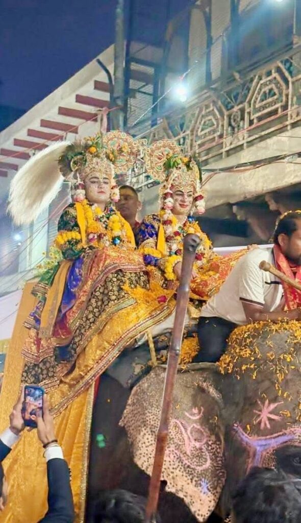 भगवान श्रीकृष्ण और बलराम के दिव्य स्वरूप हाथी पर सवार होकर जब शोभायात्रा में निकले तो भक्तों ने पुष्पवर्षा कर उनका भव्य स्वागत किया। आरती और जयघोष के साथ वातावरण “कृष्ण बल्देव की जय” के नारों से गूंज उठा।