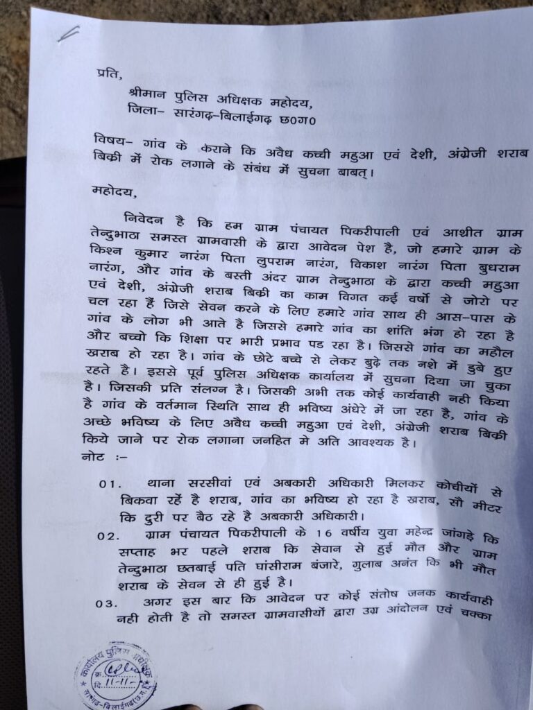ग्राम पंचायत पिकरीपाली व आश्रित ग्राम तेल्दुमभाठ के ग्रामीणों ने क्षेत्र में अवैध शराब बिक्री पर रोक लगाने की मांग करते हुए जिला पुलिस अधीक्षक को लिखित आवेदन सौंपा। ग्रामीणों ने बताया कि गांव में कच्ची महुआ, देसी और अंग्रेजी शराब की खुलेआम बिक्री हो रही है, जिससे सामाजिक वातावरण बिगड़ रहा है और युवाओं सहित वृद्ध भी नशे की चपेट में आ चुके हैं।